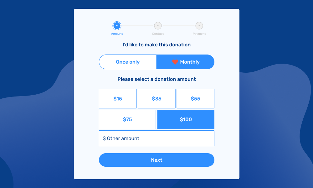 Rather than hiding monthly giving or forcing it through pop-ups, the form introduces it clearly and early. Donors can easily choose between once-only and monthly giving, without feeling pressured.